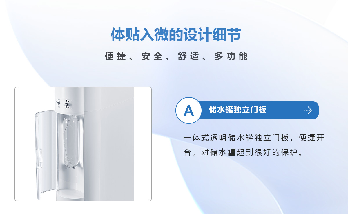 一體式透明儲水罐獨立門板,打開方便,對儲水罐起到很好的保護作用,整體美觀大方。獨立式加水裝置,使用方便、快捷。